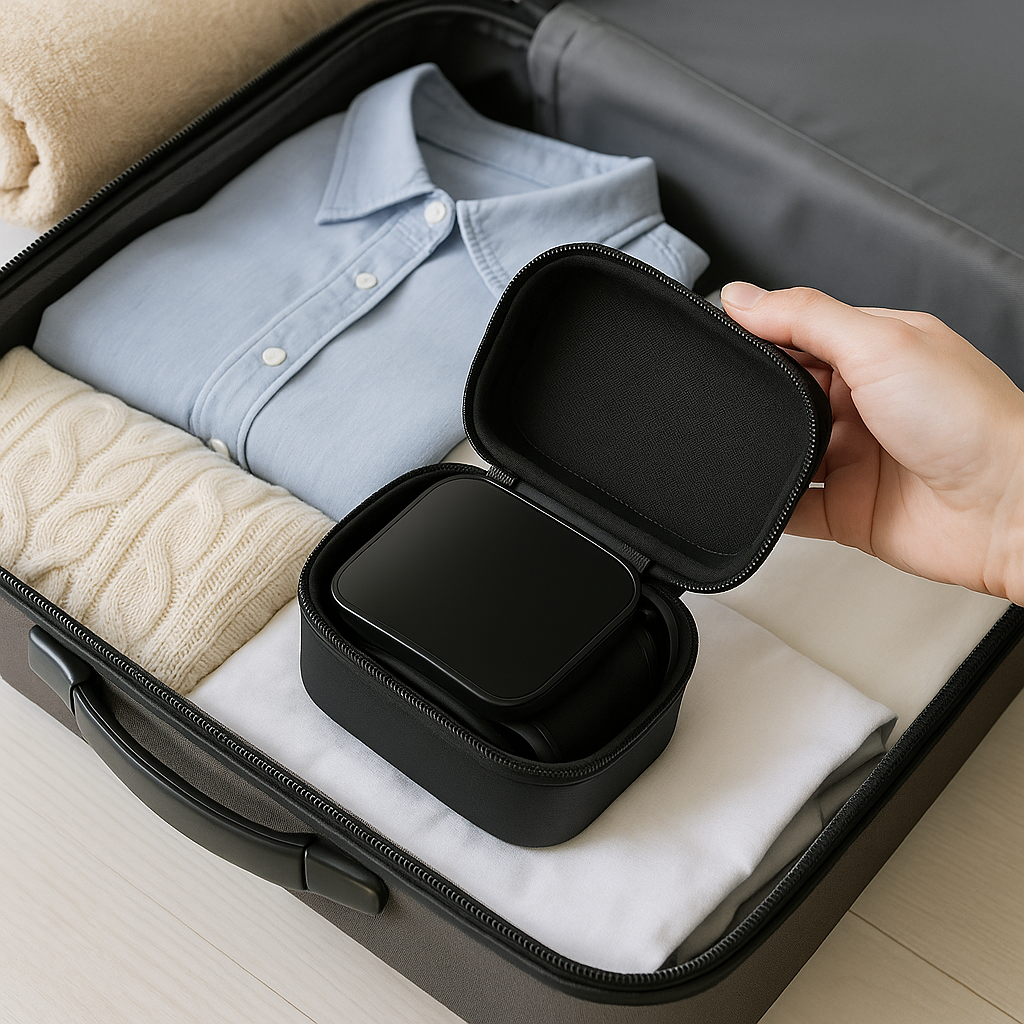 Incluye un estuche rígido de protección, ideal para viajes, trabajo, gimnasio o visitas al médico.